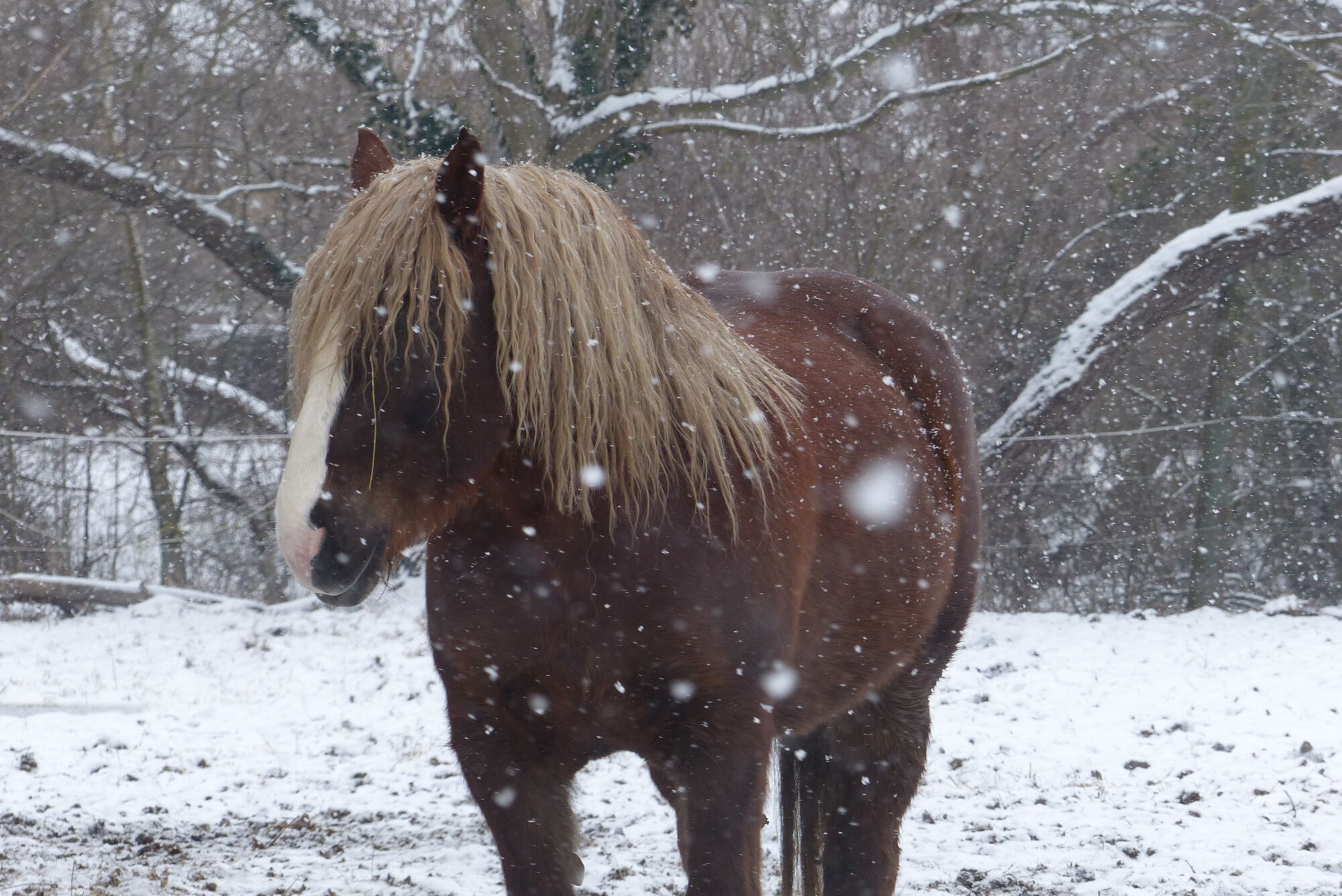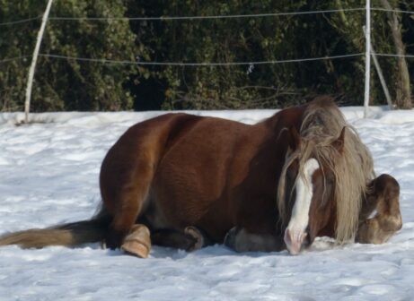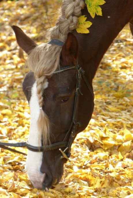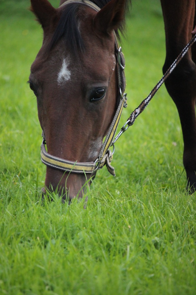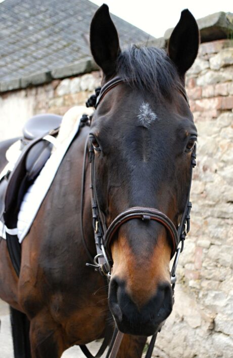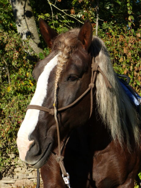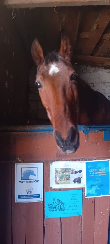 Klaus neměl jednoduchý start do života. Měl klusat se sulkou. Jenže on se zápřahu bál. Až se splašil natolik, že se celý pomlátil a zůstal mu bílý pruh na přední noze dodnes.
